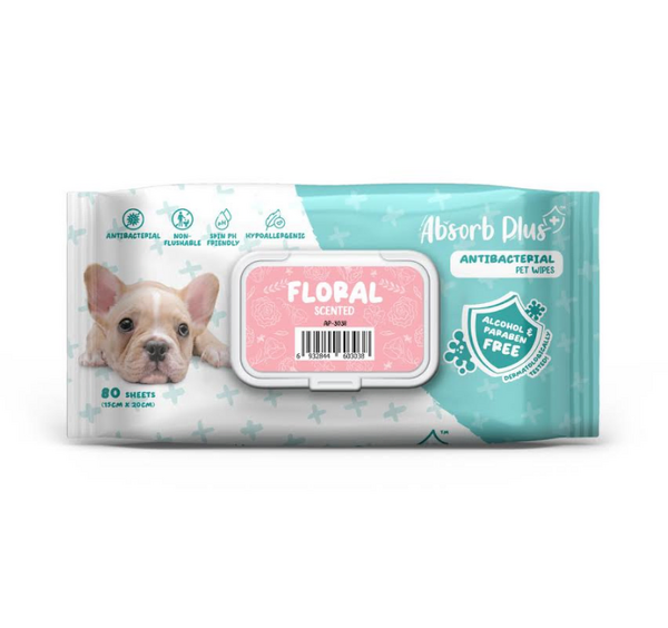 Absorb Plus Antibacterial Dog Wipes Floral - 80 Sheets (20 x 15cm)