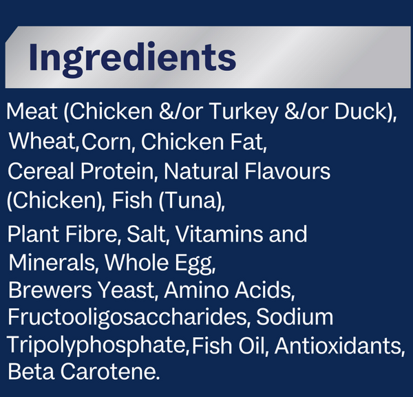 Meat (Chicken &/Or Turkey &/Or Duck), Wheat, Corn, Chicken Fat, Cereal Protein, Natural Flavours (Chicken), Fish (Tuna), Plant Fibre, Salt, Vitamins & Minerals, Whole Egg, Brewers Yeast, Amino Acids, Fructooligosaccharides, Sodium Tripolyphosphate, Fish Oil, Antioxidants, Beta Carotene.