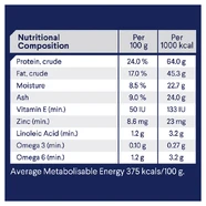 Crude Protein 24%, Crude Fat 17%, Moisture 8.5%, Ash 9%, Vitamin E (min) 50 IU, Zinc (min) 8.6mg, Linoleic Acid (min) 1.2g, Omega 3 (min) 0.10g, Omega 6 (min) 1.2g