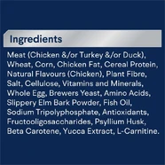 Meat (Chicken &/Or Turkey &/Or Duck), Wheat, Corn, Chicken Fat, Cereal Protein, Natural Flavours (Chicken), Plant Fibre, Salt, Cellulose, Vitamins and Minerals, Whole Egg, Brewers Yeast, Amino Acids, Slippery Elm Bark Powder, Fish Oil, Sodium Tripolyphosphate, Antioxidants, Fructooligosaccharides, Psyllium Husk, Beta Carotene, Yucca Extract, L-Carnitine.