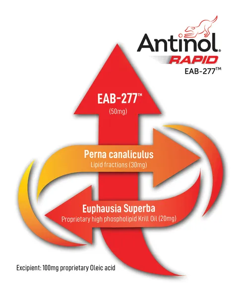 Antinol Plus features a powerful combination of two marine lipid concentrates, selected for their unique nutrient synergy. This blend is known as EAB-277 (Enhanced Animal Blend), and it provides a comprehensive range of Omega-3 fatty acids in a highly bioavailable form, along with other essential polyunsaturated fatty acids (PUFAs) and antioxidants that promote optimal health.
