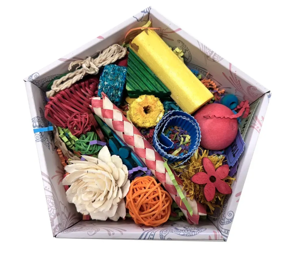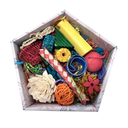 Each Happy Wings Toy Box contains a curated assortment of bird-safe toy components that may include soft loofah pieces, wicker elements, sola flowers, corrugated cardboard, crinkle paper, wooden slats, woven balls and shredded paper. Contents may vary between boxes as part of the curated variety approach - making each box a fun surprise for you and your bird.