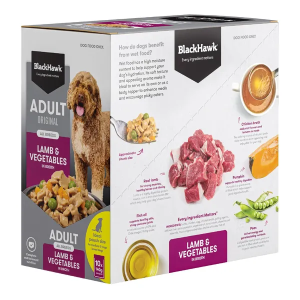 Black Hawk Adult Original Lamb & Vegetables in Broth is a complete and balanced wet food designed to support the health and vitality of adult dogs of all breeds. This 140 g pouch is an ideal serving size for medium to large breed dogs, providing great taste, hydration and everyday nutrition in a soft texture dogs love.