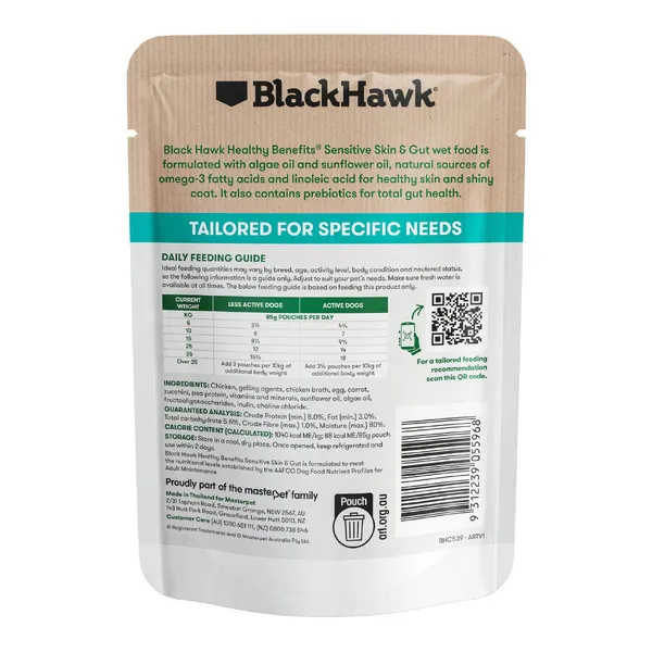 When feeding alongside Black Hawk Healthy Benefits Sensitive Skin & Gut dry food, reduce dry food by 24g for each 85g pouch fed per day.