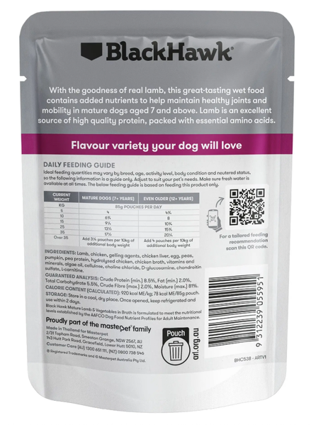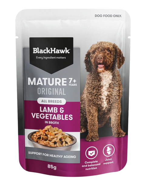 Black Hawk Original Mature Lamb & Vegetables Wet Dog Food is a complete and balanced wet meal specially developed for mature dogs aged 7 years and over. This recipe supports the changing nutritional needs of senior dogs while providing a soft texture and rich broth that is easy to eat and gentle on ageing teeth and digestion.