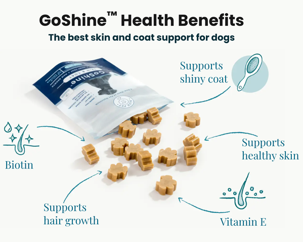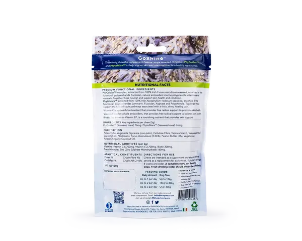 GoShine™ by Blue Pet Co is a natural, vet-designed skin and coat supplement for dogs, super-powered by two unique seaweed complexes PhyCoidan™ and PhytoMara™. Together, these bioactive Irish seaweed extracts nourish your dog's skin from the inside out, supporting a thicker, shinier and healthier coat while reducing irritation, dandruff and excess shedding.