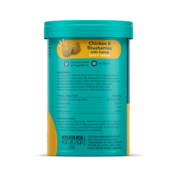 Chicken (40%), Wheat Flour, Rice Flour, Tapioca Starch, Potato Starch, Glycerine, Blueberries (3.1%), Hydrolysed Chicken, Chicken Digest, Natural Preservative (Citric Acid, Buffered White Distilled Vinegar), Salt, Guar Gum, Natural Colour (Curcumin), Catnip (0.3%), Liver, Calcium Carbonate, Taurine, Natural Antioxidant.