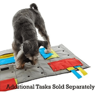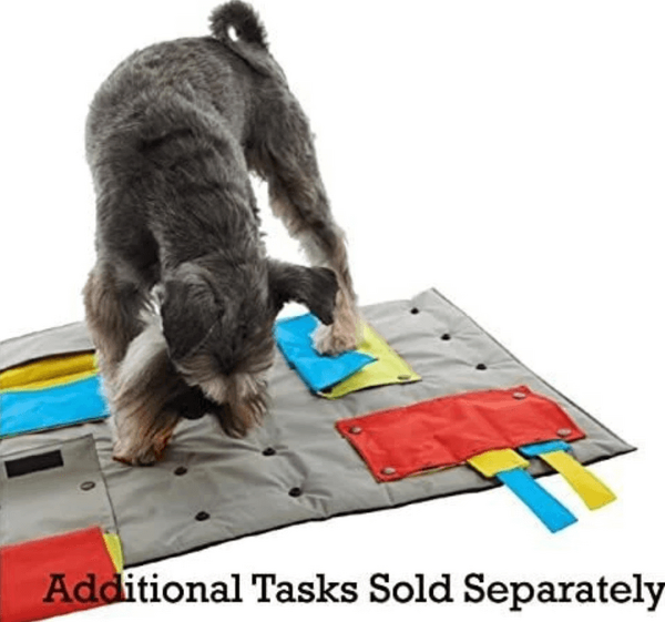 The ActivityMat is equipped with 35 press-studs spaced 35cm apart. You may connect several "tasks" or activities to the mat, most of which have variable levels of difficulty based on whether the tasks are folded or left open. The mat accommodates one or more puzzles at the same time, providing for a variety of combinations that will keep you and your dog entertained for hours.