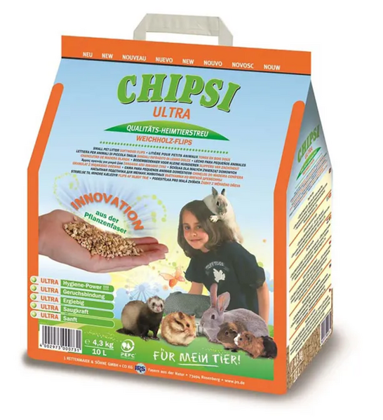 Chipsi Ultra is a high-performance bedding made from small softwood granules with an irregular surface, specifically designed to absorb both liquid and odor quickly and efficiently. This superior absorbency ensures a cleaner, fresher environment for your small animals. Perfect for rats, mice, guinea pigs, rabbits, and other small pets, Chipsi Ultra offers a safe, comfortable, and long-lasting solution for pet bedding. Its exceptional durability means it stays fresh longer, reducing the need for frequent changes and providing a more convenient and hygienic option for both you and your pets.