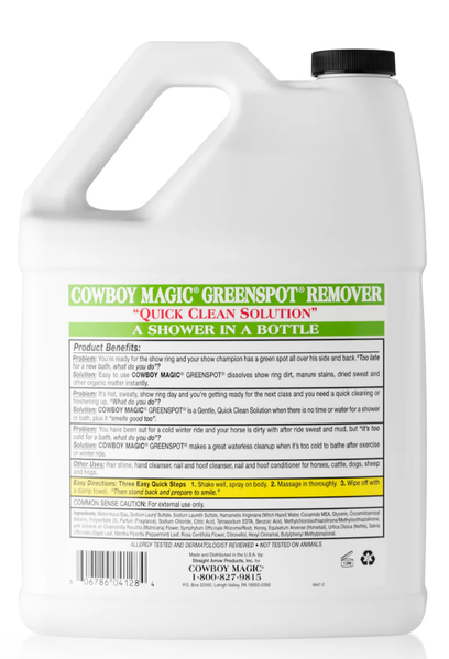 Formulated with a blend of natural ingredients, Cowboy Magic® Greenspot Remover delivers powerful cleaning performance while remaining gentle on skin and hair. Witch Hazel acts as a natural astringent, lifting away dirt, sweat, and manure stains while refreshing the coat. Honey provides deep hydration, helping to lock in moisture and enhance natural shine. Meanwhile, Glycerin softens and conditions the hair, leaving it smooth, glossy, and manageable.