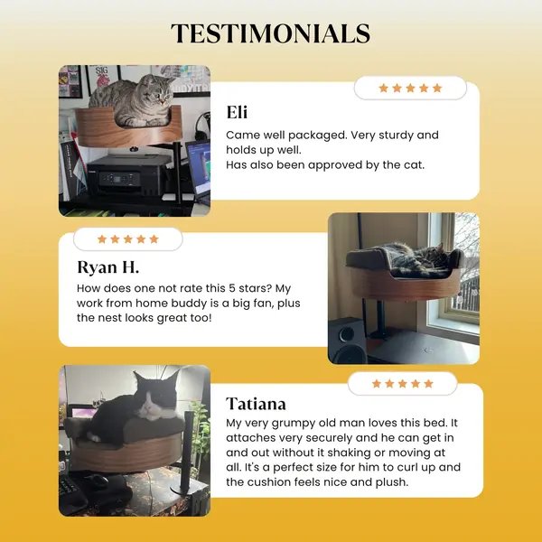 Cats naturally prefer elevated positions as they feel safer and more relaxed off the ground. The Desk Nest® allows your cat to stay near you while keeping your keyboard, paperwork, and desk surface paw-free.