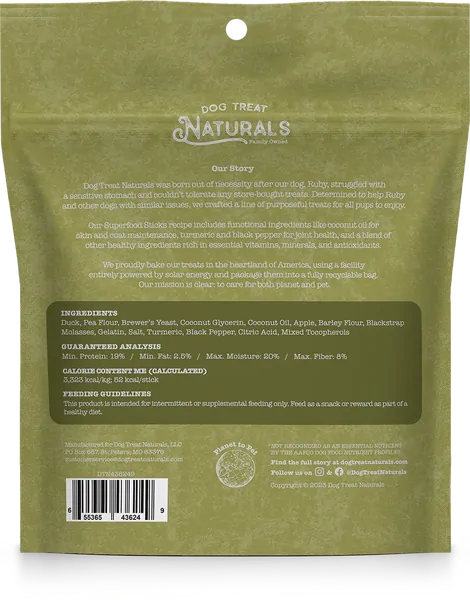 Dog Treat Naturals Duck & Apple Superfood Sticks are a flavourful and functional snack made with real duck and crisp apple. Packed with protein and a natural touch of sweetness, these soft sticks deliver a nutrient boost while satisfying your dog’s cravings.