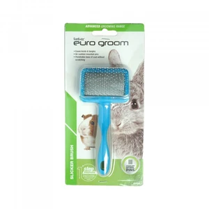 The Euro Groom Mini Slicker Brush is ideal for removing knots, tangles, and loose debris from hair. This slicker brush is fitted with ball-tipped stainless steel pins that detangle matted hair without harming the skin. It is lightweight and easy to use, featuring a pleasant easy-grip handle and an air cushion base. This brush is ideal for tiny animals like rabbits, guinea pigs, and rodents, and will maintain their coat in great condition all year.