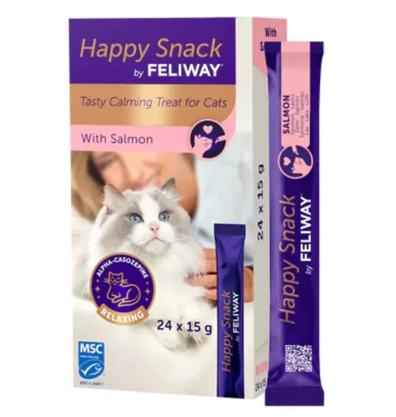 Feliway Happy Snack Salmon is a creamy, palatable lickable treat formulated to provide genuine emotional support for cats during stressful situations and life transitions. Combining a rich salmon flavour with a scientifically backed calming ingredient, each single-serve sachet delivers a soothing experience that helps your cat feel more relaxed, comfortable and secure - whether you're navigating a vet visit, a house move, the arrival of a new family member or any other situation that tends to unsettle your feline friend.