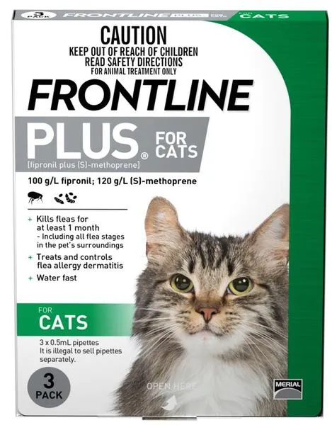 Frontline Plus is an easy to use effective flea control for cats. Simply apply one pipette to the back of your cats neck and your cat will be flea free for a month. So easy, convenient and it works