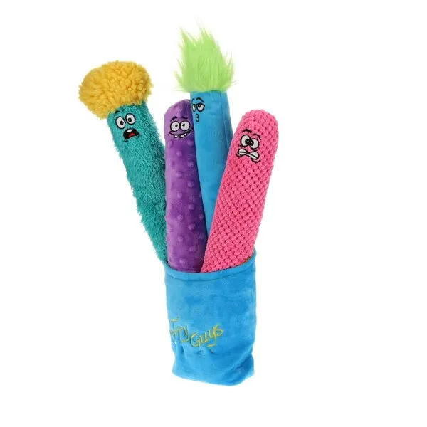 4crinkly plush sticks with attitude all together in a fun fry packet to store them in. Crinkle, squeak, thrash and fetch with these big personality toys, while engaging dogs in stimulating play. Two layers of durable fabric make these guys as tough as they are cute! Multiple fabrics and textures stimulate play, including corduroy, medium-pile plush, and bubble plush across the Fry Guys range.