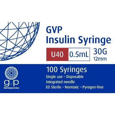 The GVP Insulin Syringes are designed for accurate, comfortable insulin administration for pets requiring 40IU (U-40) dosing. Each sterile, single-use syringe includes an integrated 30G x 1/2" needle for smooth, low-resistance injections.