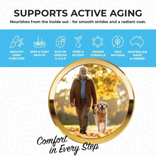 Rich in naturally occurring Omegas 3, 6, and 9, including DHA and EPA, this daily-use supplement supports dogs that are slowing down with age, experiencing stiffness, or requiring additional joint and skin support as part of a balanced diet.