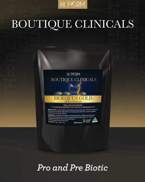 Hi Form BioEquus Gold is a powdered digestive support supplement formulated to promote a healthy gut microbiome and support the digestive system in horses. It is particularly suited to horses diagnosed with, or prone to, ulcers and other digestive disorders.
