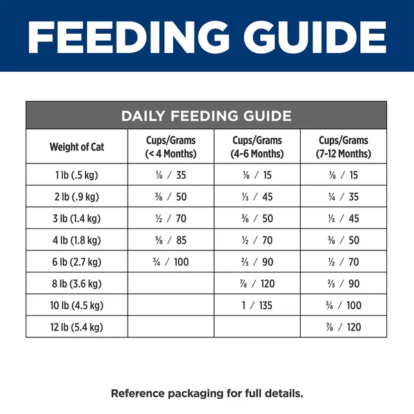 Always provide fresh drinking water. If introducing this food for the first time, mix increasing amounts of the new food with decreasing amounts of the old food over 7 days. Adjust feeding amounts as needed to maintain optimal body weight. For nursing cats, keep food available at all times.