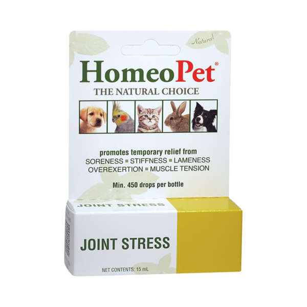 HomeoPet Joint Stress is a natural remedy designed to provide joint relief for both young and older pets experiencing stiffness, sore joints, and discomfort. It is ideal for pets with arthritis, osteoarthritis, difficulty rising, joint stiffness, joint inflammation, and pain associated with damp, cold weather or injury.