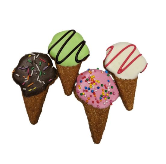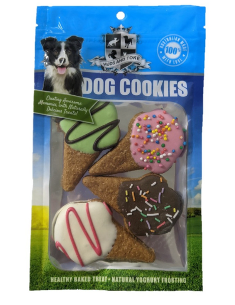 Huds & Toke Ice Cream Cone Cookies are adorable, crunchy dog treats topped with a no-melt yoghurt and carob frosting. Perfect for rewarding, celebrating, or adding a little joy to your dog’s day, these colourful cookies bring both flavour and fun to treat time.