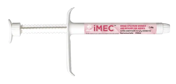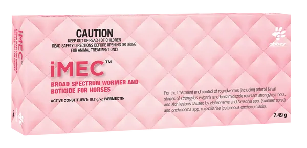 iMEC™ Broad Spectrum Wormer and Boticide provides reliable, effective parasite control in a low-volume oral paste. Formulated with ivermectin, it targets a wide range of internal parasites including roundworms, benzimidazole-resistant strongyles, bots, and skin lesions caused by Habronema and Draschia spp. (summer sores), as well as Onchocerca spp. microfilariae.