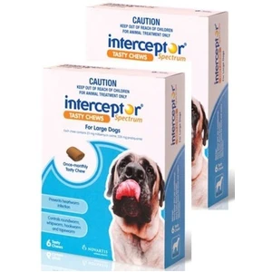 Rated 5/5 based on 11 reviews.Interceptor Spectrum is a monthly palatable meaty Chew for the prevention of heartworm and the treatment and prevention of roundworm, hookworm and whipworm and tapeworm in dogs.