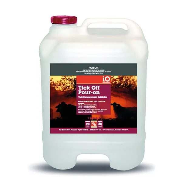 iO Tick Off Pour On is a tick development inhibitor containing the insect growth regulator fluazuron 25 g/L. It interferes with chitin synthesis in larval stages of cattle tick, controlling susceptible strains of Boophilus microplus and inhibiting tick development within three days. Ready-to-use pour-on formulation.