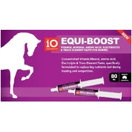 It contains concentrated vitamins, minerals, amino acids, electolytes & trace paste. These ingredients work to replace the key nurtients lost during your horses training and excercise. IO Equi-Boost is an easy to use 4-in-1 combination paste for horses. It contains water coluable vitamins ideally suited for horses being excercised, travelling or exposed to the warm conidions. Ths amino acids and electolytes contained help your horses body to recover faster post excercise or travel. The convenient paste application is palatable and easy to mix into your horses feed.