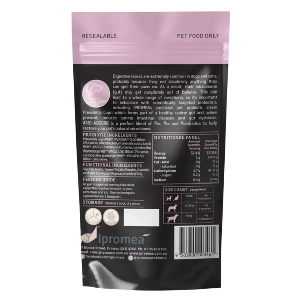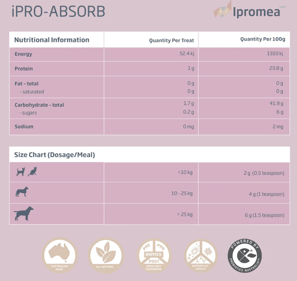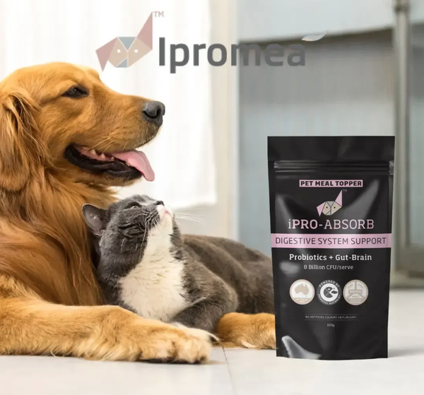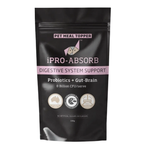 iPRO-ABSORB by Ipromea is a premium probiotic meal topper scientifically formulated to strengthen your pet’s digestive system and support the gut-brain connection. Designed for both dogs and cats, this Australian-made formula promotes balanced digestion, improved nutrient absorption, and emotional wellbeing.