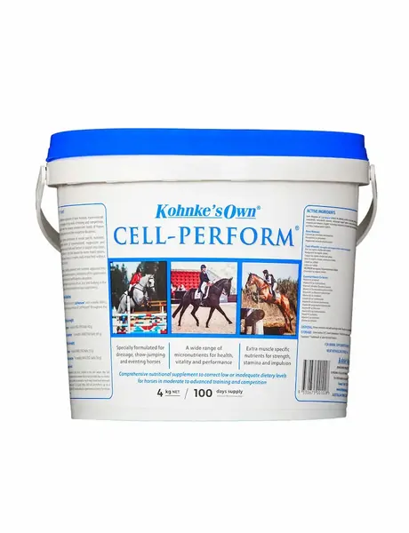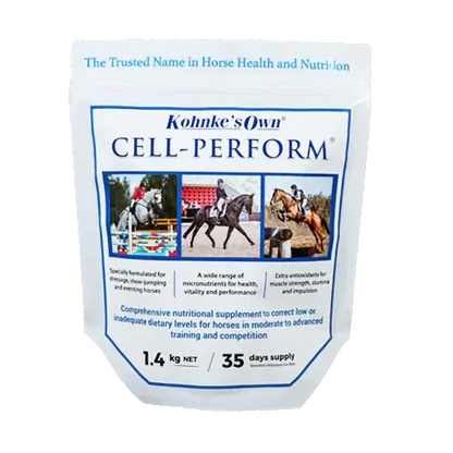 Kohnke’s Own Cell-Perform is a scientifically formulated nutritional supplement designed for equestrian horses in training and competition. This advanced multi-nutrient blend delivers essential vitamins, minerals and antioxidants to help balance the diet and support overall health, stamina and muscle function.