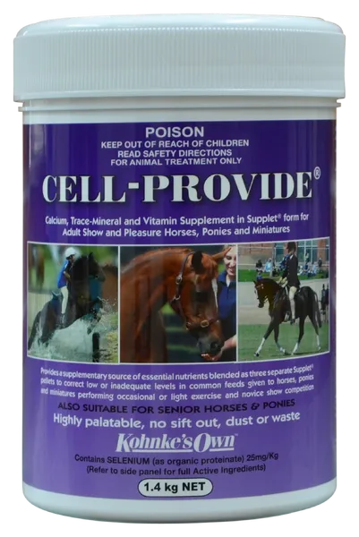 Kohnke’s Own Cell-Provide is a scientifically formulated vitamin and mineral supplement designed specifically for lightly worked, resting, senior, and aged horses and ponies. It provides a comprehensive range of essential nutrients to balance pasture and hay-based diets, ensuring optimal health, vitality, and wellbeing without adding extra energy, sugar, or starch.