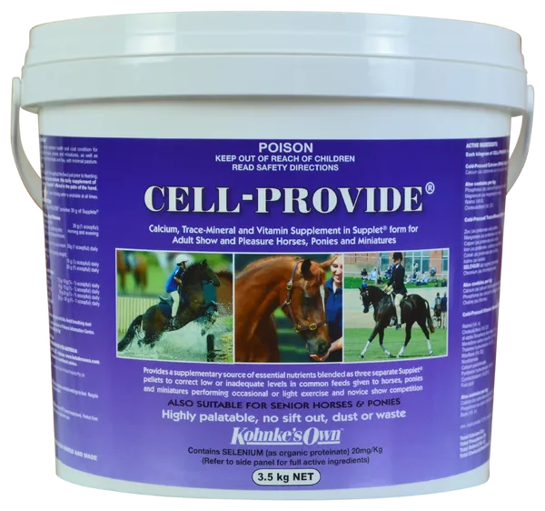 Kohnke’s Own Cell-Provide is a scientifically formulated vitamin and mineral supplement designed specifically for lightly worked, resting, senior, and aged horses and ponies. It provides a comprehensive range of essential nutrients to balance pasture and hay-based diets, ensuring optimal health, vitality, and wellbeing without adding extra energy, sugar, or starch.