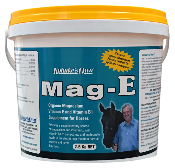 Kohnke’s Own Mag-E is Australia’s most popular calming supplement, trusted by riders nationwide to support relaxed behaviour without dulling performance. Featuring a unique blend of organic magnesium chelate, vitamin E, B1, natural yeasts, and synergistic nutrients, Mag-E helps keep horses calm, focused, and ready to perform.