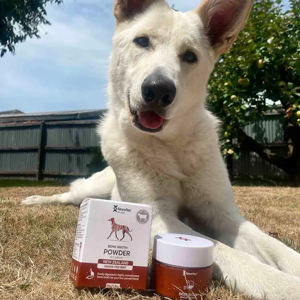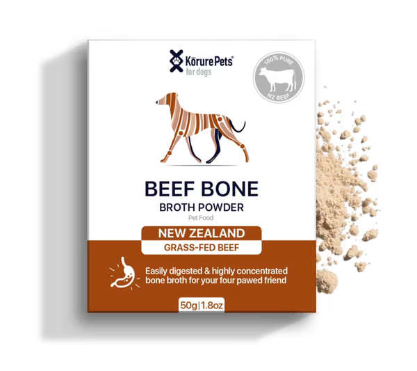 Korure Pets Beef Bone Broth Powder is made from 100% pure New Zealand beef and provides a highly concentrated, easily digestible nutritional boost for dogs. Rich in protein, collagen and essential nutrients, this premium broth powder supports digestion, joint health and overall wellbeing.