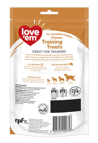 Support your dog’s training sessions with Love Em Chicken Training Treats 200g, a delicious and nutritious reward option suitable for dogs of all breeds and ages. These soft, easy-to-chew pieces are perfect for teaching essential commands such as sit, stay, and roll over, making them an excellent companion for everyday training.