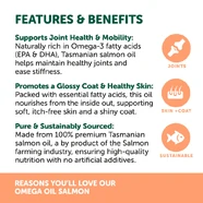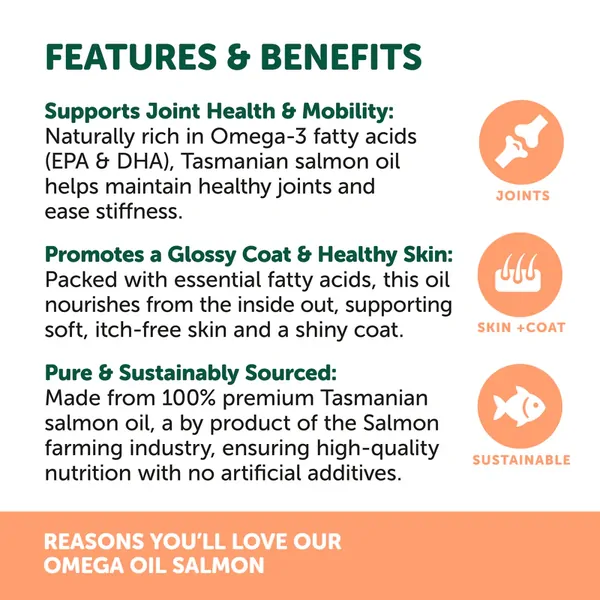 - Pure & Sustainably Sourced: Made from 100% premium Tasmanian salmon oil — a byproduct of the salmon farming industry — ensuring quality and sustainability.