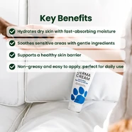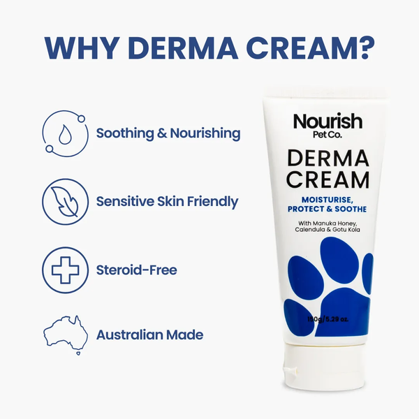 Nourish Pet Co Derma Cream is a deeply hydrating, fast-absorbing moisturiser formulated to support dry, flaky, and sensitive skin. Designed to nourish and protect your pet’s natural skin barrier, this gentle cream restores moisture without leaving a greasy residue.