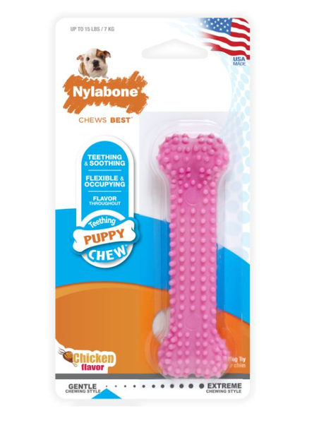 Help your puppy develop healthy chewing habits from the very beginning with the Nylabone Puppy Bone Chicken Petite Pink. Specially designed for teething puppies, this gentle chew toy is made from a softer material to provide soothing comfort for sensitive gums while offering a safe and satisfying outlet for natural chewing behaviour.