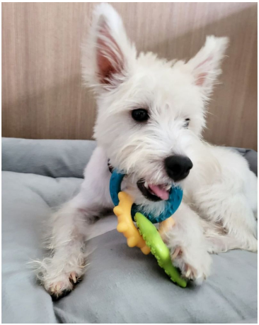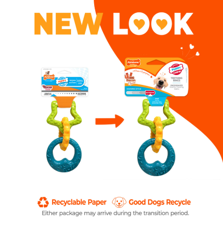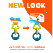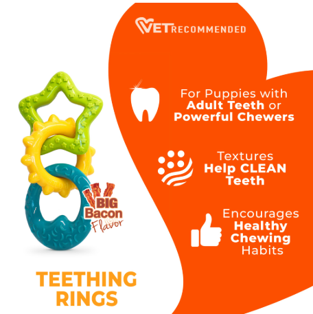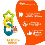 Each ring is infused with an irresistible bacon flavour that keeps puppies engaged for longer, while the textured surfaces help gently reduce plaque and support fresher breath through natural chewing action. Shaped for playful chewing and comfortable grip, this teething toy offers both entertainment and relief during an important developmental stage.