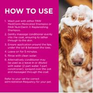 Apply a generous amount to the coat after shampooing, gently massaging through the fur and into the skin. Leave on for several minutes for maximum benefit, then rinse thoroughly. Use in conjunction with PAW NutriDerm® Replenishing Shampoo for optimal results.