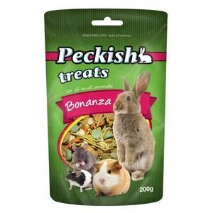 - Peckish Treats "Bonanza" has been formulated from high quality ingredients as a treat for your little friend. Ideally suited as a breakfast treat, it has a great balance of cereals, dried fruit, extruded fruit treats and high fibre mini twigs.