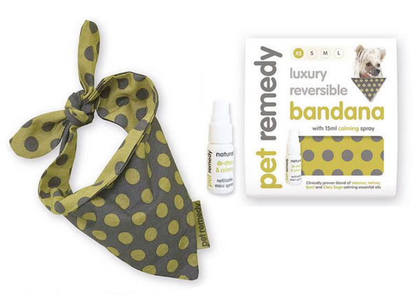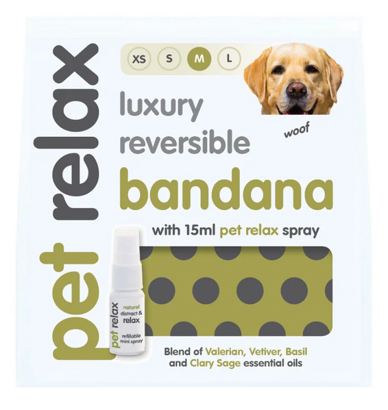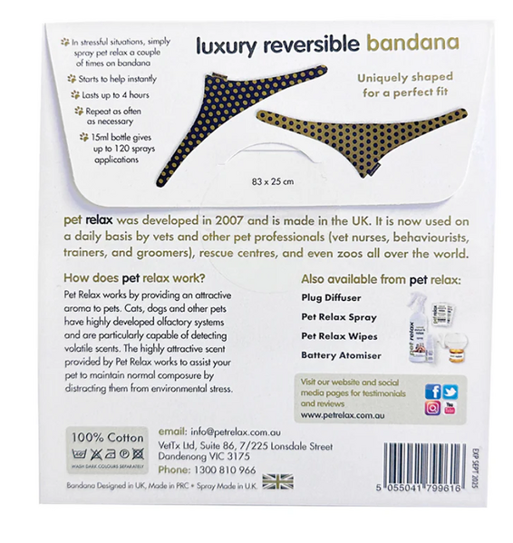 when your pet is stressed or in an anxious situation - pop on the bandana with a couple of sprays of the pet relax spray to help ease anxiety and stress