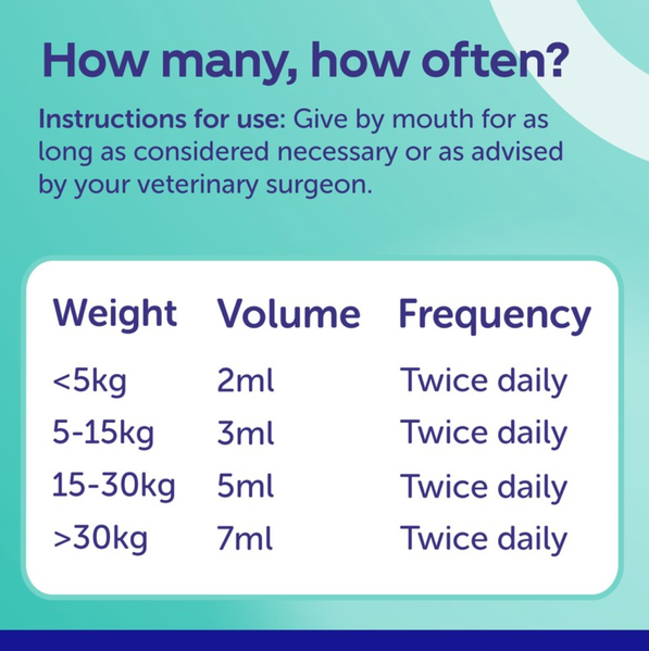 5-15kg body weight, give 3ml twice daily