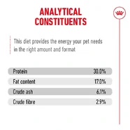 Moisture 5.5%, Protein 30%, Fat content 17%, Crude fibre 2.9%, Crude ash 6.1%, Nitrogen-free extract 38.5%. Metabolisable energy: 4033 kcal/kg.