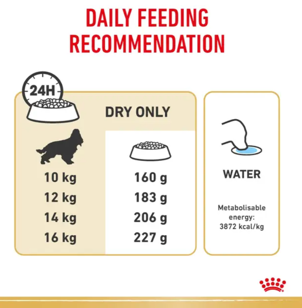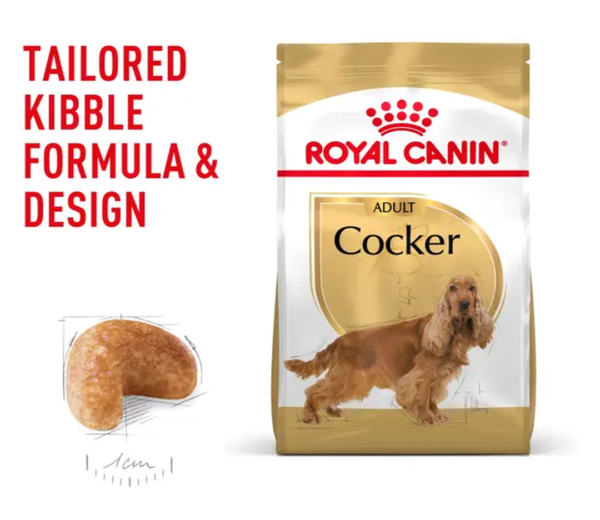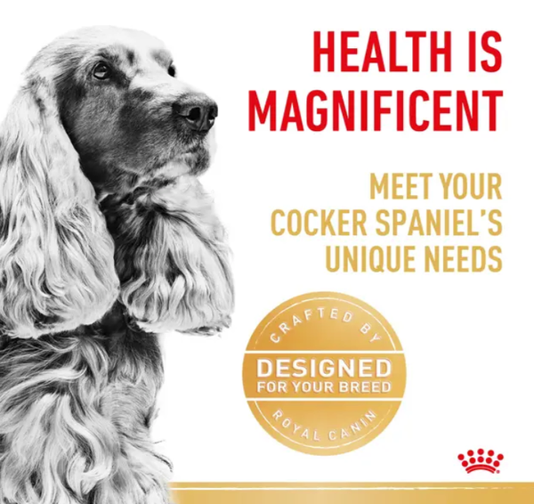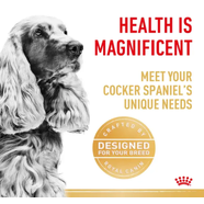 Royal Canin® Cocker Spaniel Adult is a breed-specific formula designed to meet the unique nutritional needs of adult English or American Cocker Spaniels aged 12 months and older. Known for their affectionate nature and silky coats, Cocker Spaniels benefit from a diet that supports skin health, ideal weight, and cardiac function—this formula does just that.