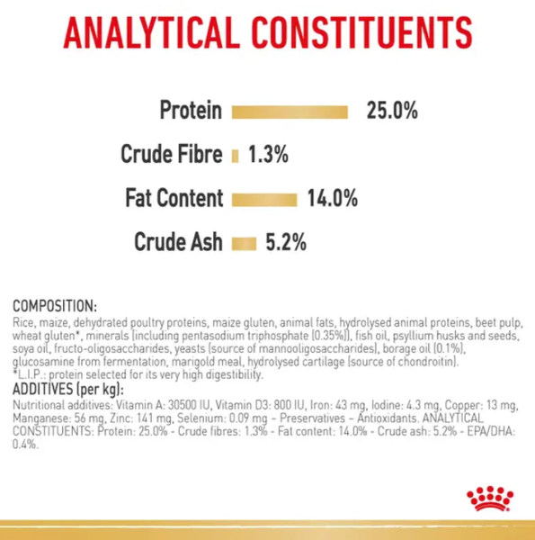 Rice, dehydrated poultry protein, wheat, maize, animal fats, hydrolysed animal proteins, wheat gluten*, maize gluten, beet pulp, vegetable fibres, fish oil, minerals, soya oil, fructo-oligosaccharides, borage oil (0.1%), marigold meal (source of lutein), hydrolysed yeast (source of mannan-oligosaccharides), taurine.