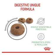 A healthy digestive system is essential for your cat’s overall wellbeing. ROYAL CANIN® Digestive Care is precisely formulated to support digestive health and promote optimal stool quality in adult cats with sensitive stomachs. This highly palatable formula contains L.I.P. proteins (selected for high digestibility), a targeted fibre blend—including psyllium—to regulate intestinal transit, and prebiotics to nourish a healthy gut microbiome.