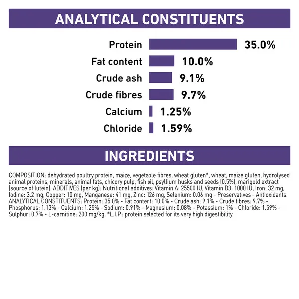 Composition: dehydrated poultry protein, maize, wheat gluten*, rice, maize gluten, hydrolysed animal proteins, vegetable fibres, animal fats, minerals, chicory pulp, fish oil, soya oil, fructo-oligo-saccharides, psyllium husks and seeds, marigold extract (source of lutein). Additives (per kg): Nutritional additives: Vitamin A: 20500 IU, Vitamin D3: 700 IU, E1 (Iron): 42 mg, E2 (Iodine): 3 mg, E4 (Copper): 5 mg, E5 (Manganese): 55 mg, E6 (Zinc): 180 mg - Preservatives - Antioxidants.Analytical constituents: Protein: 40% - Fat content: 10% - Crude ash: 8.9% - Crude fibres: 5.1% - Starch: 23.9%. *L.I.P.: protein selected for its very high assimilation. Metabolisable energy: 358.3 kcal.